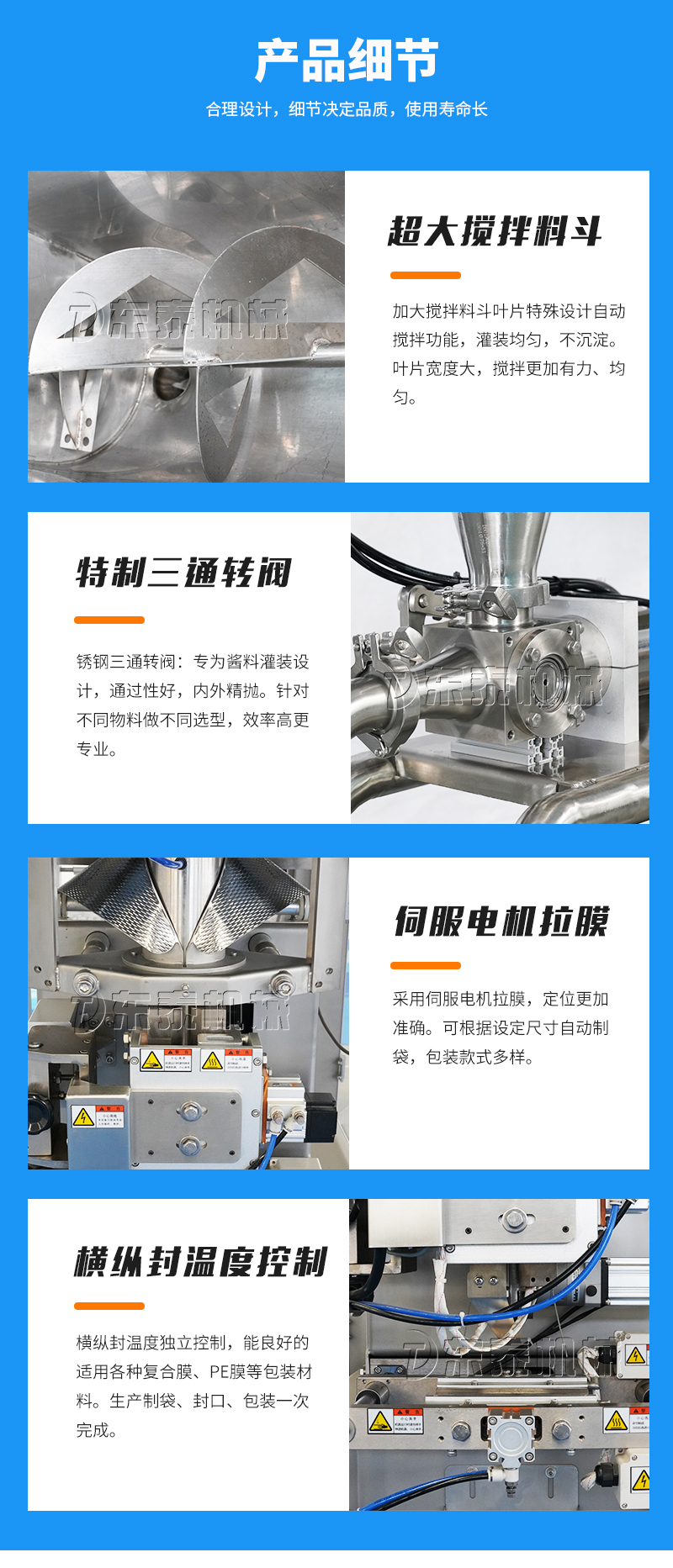 牛肉醬灌裝包裝機(jī)械主要用于調(diào)味品醬料的自動(dòng)化包裝,機(jī)器安裝有橫向螺帶式攪拌,使油醬混合均勻,確保灌裝精度和產(chǎn)品包裝成品的均勻性。灌裝計(jì)量設(shè)備安裝有萬向輪,管路鏈接均采用快拆接頭,方便灌裝機(jī)拆卸移動(dòng)清洗。包裝設(shè)備采用全伺服驅(qū)動(dòng)器,包裝速度快,運(yùn)行穩(wěn)定。